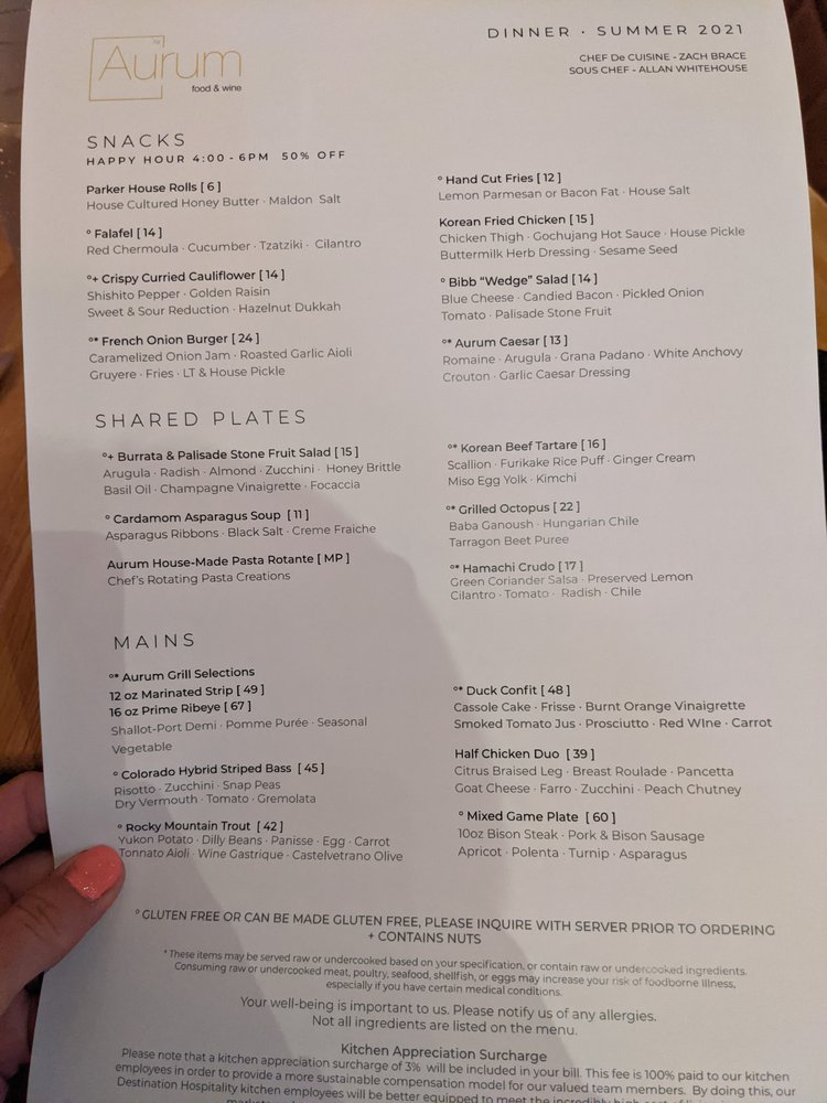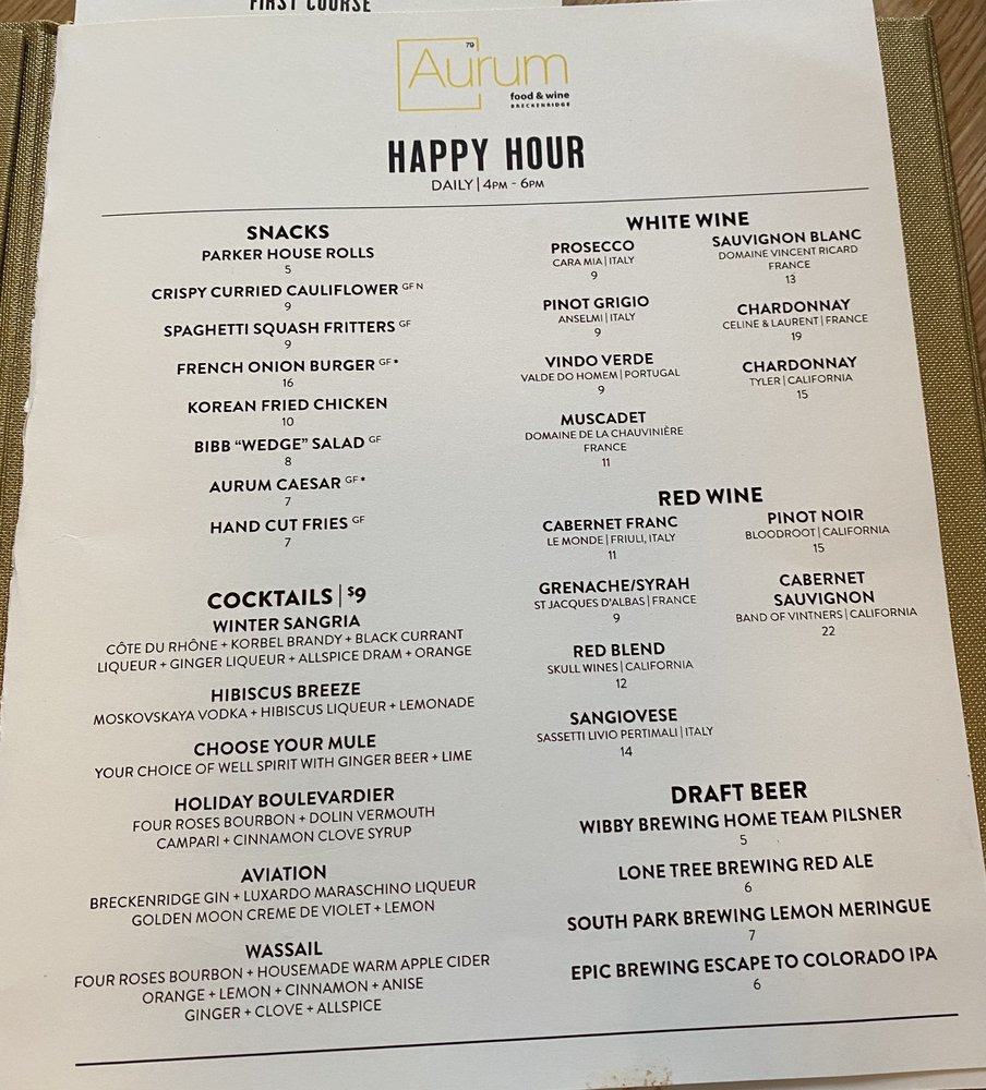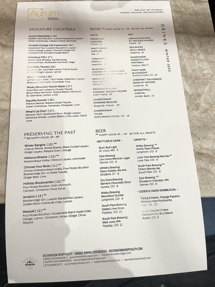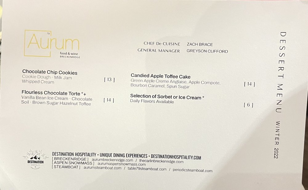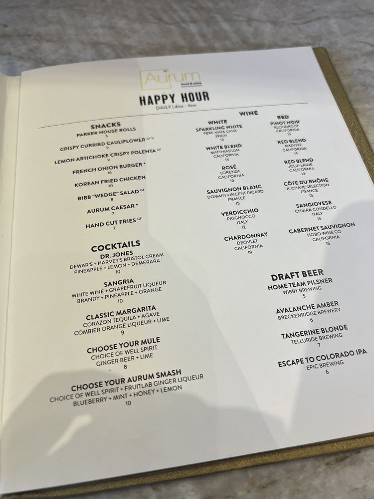 Aurum Food & Wine Breckenridge, located in Breckenridge, CO, offers a diverse menu featuring New American cuisine with a focus on quality ingredients and creative flavors. With many vegetarian options available, the restaurant caters to a variety of preferences. The chic and classy ambiance, along with amenities such as outdoor seating and happy hour specials, make it a great spot for groups and kids alike. Customers rave about signature dishes like the Crispy Curried Cauliflower and the Mushroom & Gruyère Soup, showcasing the chef's innovative approach to traditional favorites. The attentive service and extensive drink options, including NA drinks and cocktails, further enhance the dining experience. Overall, Aurum Food & Wine Breckenridge is a must-visit for those seeking a high-quality and memorable dining experience in Breckenridge.